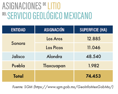 Además de las concesiones privadas, existen en la actualidad cuatro asignaciones mineras para explorar litio a cargo del Servicio Geológico Mexicano (SGM). Dichos yacimientos comienzan a ser considerados “estratégicos”.