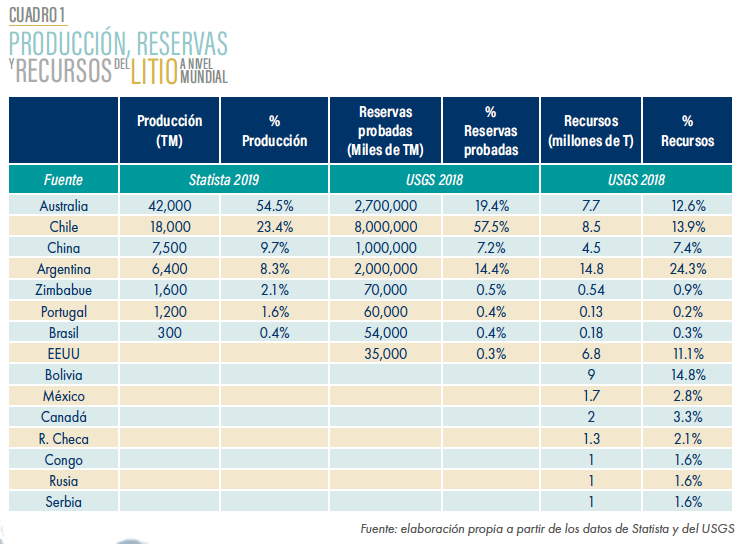 El litio que se extrae actualmente se encuentra en dos formas: litio en roca o litio en salmuera o salares. Mientras la producción del primero se concentra en Australia, el litio en salares se distribuye principalmente en países sudamericanos como Argentina y Chile (ver cuadro 1).