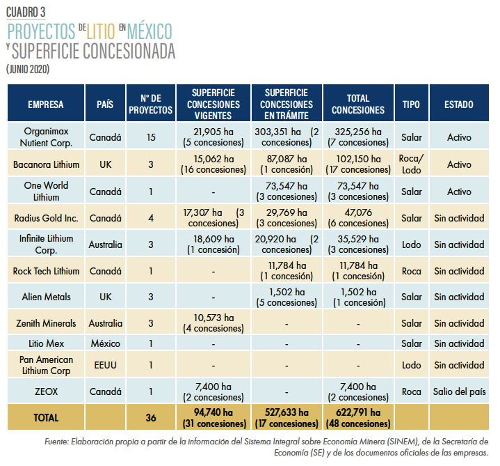 En México, existen 36 proyectos mineros de capital extranjero para la extracción de litio controlados por 10 empresas (ver dato crucial 5) (ver cuadro 3 y gráfico 5). En su mayoría no tienen actividad y están controlados por pequeñas empresas canadienses que dependen de la especulación para tener ingresos. Únicamente tres empresas tienen capacidad para avanzar en sus proyectos: Organimax, Bacanora Lithium y One World Lithium.