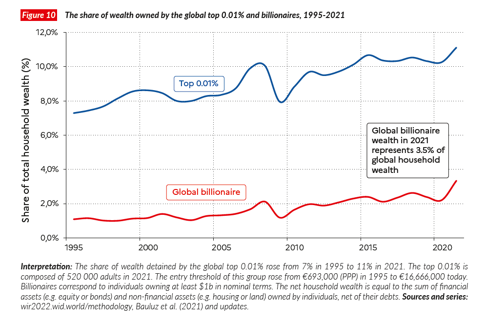 Al interior del sector privado también ha aumentado la desigualdad de la riqueza. Los multimillonarios concentran una desproporcionada cuota de la riqueza global: el 1% más rico, acaparó 38% de la riqueza acumulada desde mediados de la década de 1990 y el 50% más pobre sólo ganó 2%. Desde 1995, la riqueza global en manos de los multimillonarios ha crecido de 1 a 3%, incremento exacerbado durante la pandemia por Covid-19.