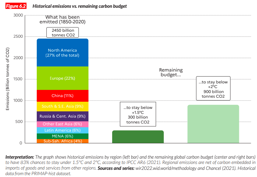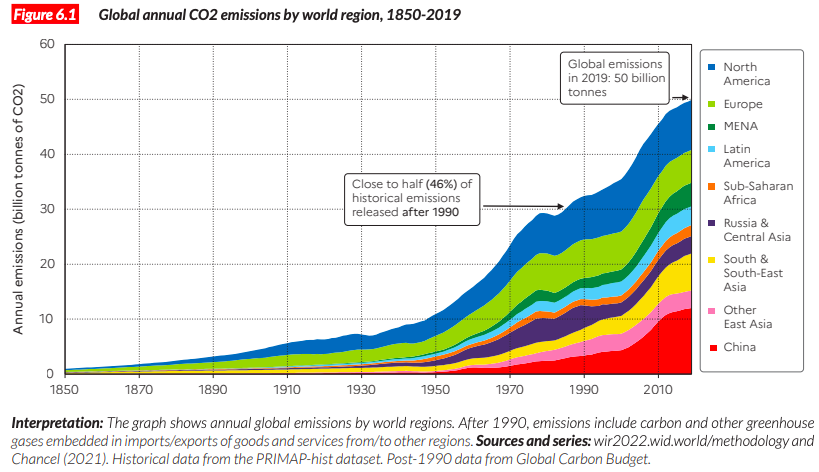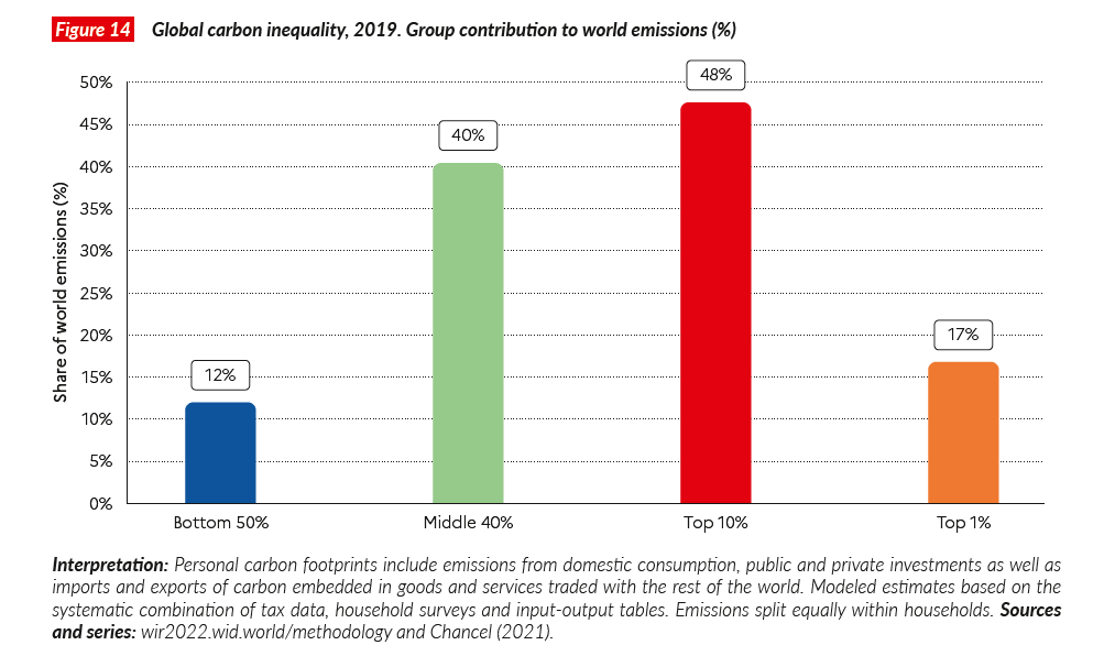 Los autores señalan la estrecha relación entre la desigualdad de ingresos y riqueza y las contribuciones al cambio climático. En promedio, los humanos emiten 6.6 toneladas equivalentes a dióxido de carbono anualmente. Los datos del informe indican que el 10% de los emisores son responsables por 50% de todas las emisiones (Dato Crucial 1).