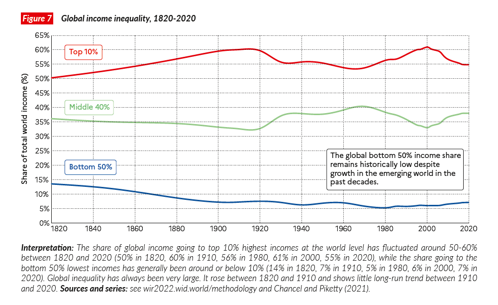 Los autores advierten que la desigualdad mundial contemporánea se asemeja a la de la época dorada del imperialismo occidental a inicios del siglo XX. De hecho, “la cuota de ingresos en manos de la mitad más pobre del mundo es cerca de la mitad de lo que era en 1820, antes de la gran separación entre los países de Occidente y sus colonias” (p. 12).