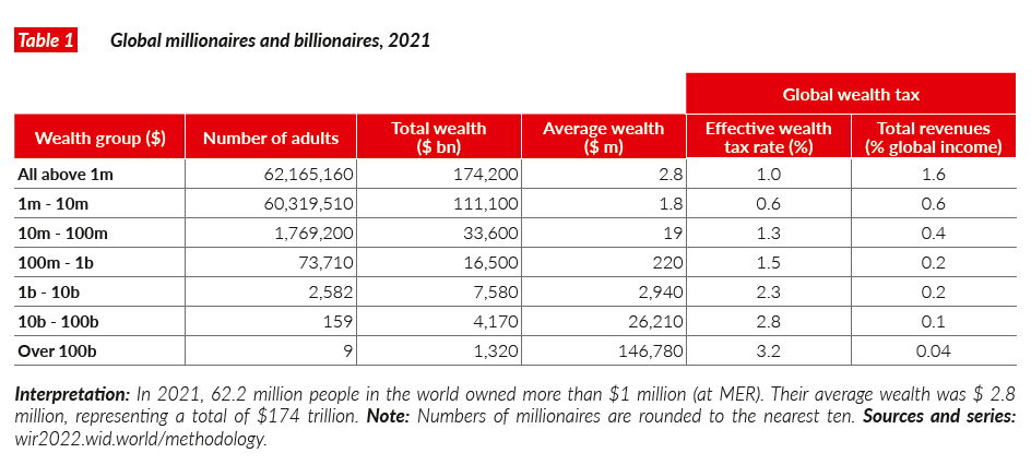 Los autores proponen el establecimiento de un impuesto progresivo a la riqueza de los multimillonarios del mundo que sirva para la redistribución de la riqueza y permita enfrentar los retos del siglo XXI. En este escenario, se estima que 1.6% de los ingresos mundiales podría invertirse en educación, salud y transición ecológica.