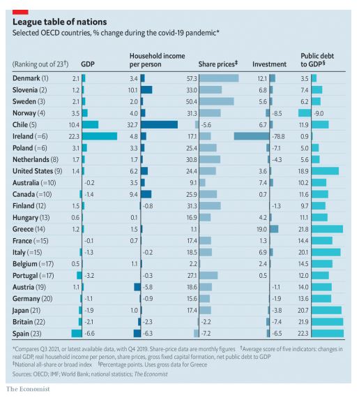 Para ello, el semanario The Economist reunió la información de 5 indicadores para medir el desempeño de los 38 países: Producto Interno Bruto (GDP por sus siglas en inglés), ingreso de los hogares, desempeño del mercado de valores, inversión de capital y deuda de gobierno.