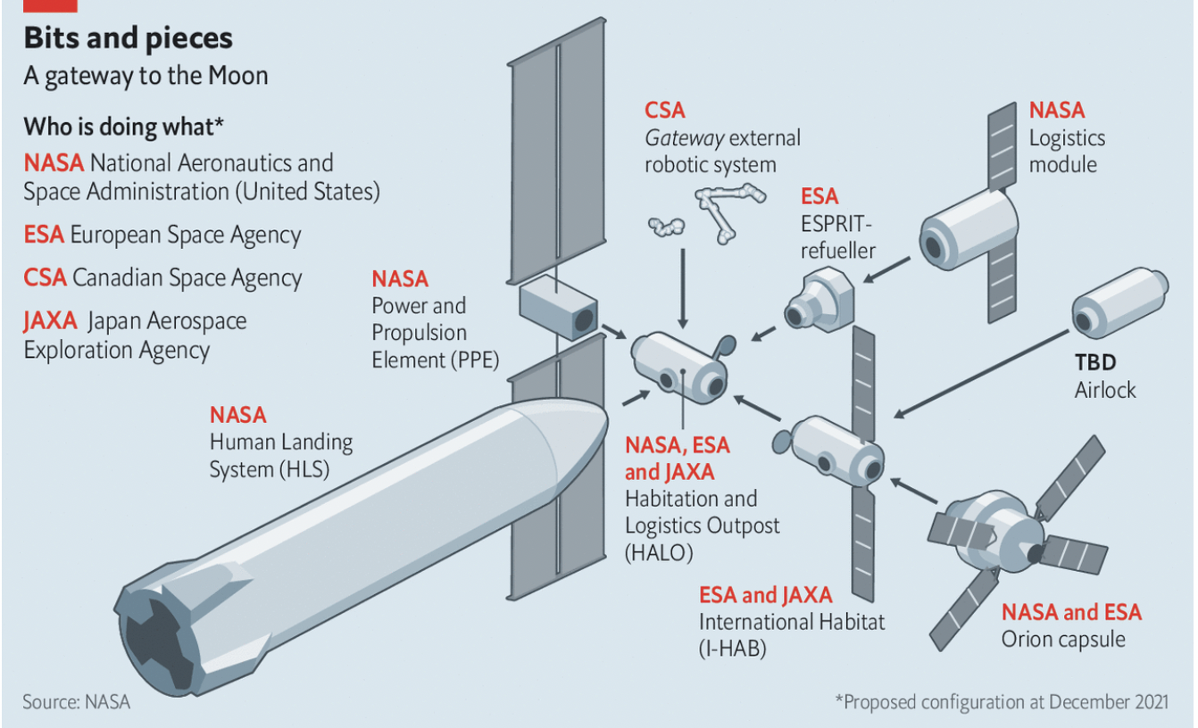 Los planes de la NASA comprenden colocar una estación lunar orbital (Gateway) desde donde se puedan realizar las misiones lunares mediante una nave; se propone volver a situar una tripulación hacia 2025, con el objetivo de establecer una base lunar. Se tienen programadas 18 misiones lunares a partir de 2022. Entre los participantes no estadounidenses está la empresa francesa Thales Alenia Space, que construye un módulo habitable y la protección de la base lunar en colaboración con la Agencia Espacial Europea, que a su vez fabrica el módulo de reabastecimiento ESPRIT para la estación Gateway.