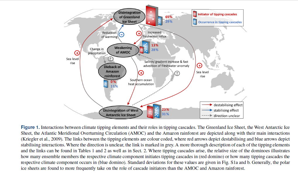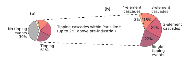 Finalmente, se concluye que en caso de que los tipping elements transgredan su umbral de temperatura debido al calentamiento global, todo el sistema climático se verá amenazado, asimismo, este riesgo aumenta considerablemente cuando se consideran las interacciones y las cascadas que éstas generan. De igual forma, se establece que la única retroalimentación negativa que se encontró (entre la capa de hielo de Groenlandia y AMOC) no es suficiente para estabilizar el sistema climático.