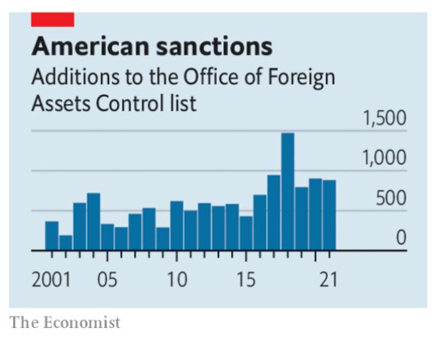 Parte de la fragmentación antes mencionada es inevitable. Al aplicar sanciones a un número cada vez mayor de países en las últimas dos décadas, y ahora también aumentando su gravedad potencial, Occidente corre el riesgo de empujar a más países a desvincularse del sistema financiero de occidente.