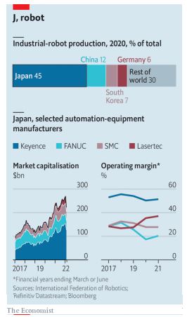 Las empresas tecnológicas japonesas Keyence, Fanuc, SMC y Lasertec actualmente tienen una valoración 2.5 veces más alta que cinco años atrás. Keyence y SMC obtienen más de la mitad de sus ingresos del exterior. Para Fanuc y Lasertec la proporción aumenta a 80%. Esto se debe a que en 1990, la población en edad de trabajar de Japón comenzó a reducirse, por lo que el país asiático se vio en la necesidad de reemplazar a los humanos por procesos automatizados, desde entonces Japón cuenta con una ventaja competitiva que le permite posicionarse como un país rico.