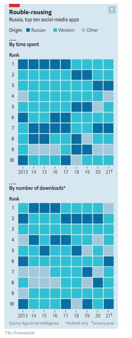 En cuestión de software, está comenzando a emplear alternativas a los softwares estadounidenses. En este caso, el impulso de la nacionalización tiene una base más sólida sobre la que apoyarse. Según Group M, el mayor comprador de medios de comunicación del mundo, Yandex, motor de búsqueda ruso que se reparte el mercado de las búsquedas en el país con Google, de Alphabet, y VK, un gigante de las redes sociales, obtuvieron juntos 1 800 millones de dólares de publicidad en 2021, más de la mitad del mercado global. VKontakte y Odnoklassniki, de VK, intercambian posiciones con aplicaciones estadounidenses (Facebook, Instagram) y chinas (Likee, TikTok) en la lista de las diez más descargadas.