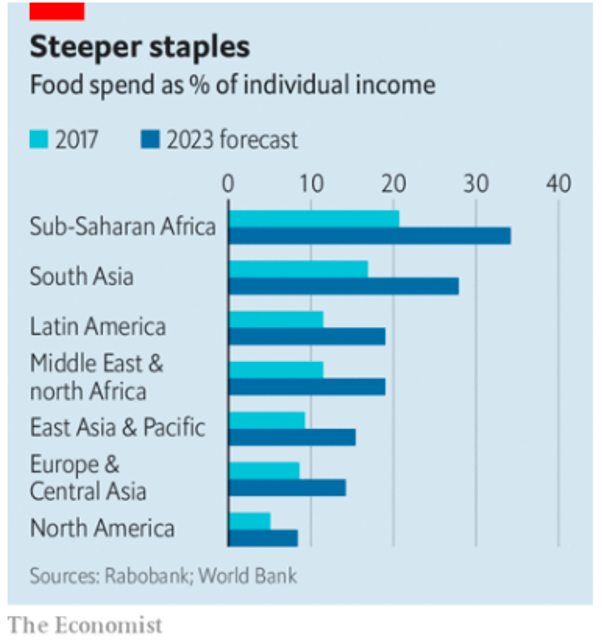 Los altos precios en insumos agrícolas y alimentos avivarán la inflación en el resto de la economía mundial, que se suman a las tensiones por los precios en los recursos energéticos. De acuerdo con The Economist, las consecuencias de la guerra se sentirán en tres maneras: interrupción de los envíos de cereales, menores o inaccesibles cosechas en Ucrania y Rusia, y producción deficiente en otras partes del mundo.