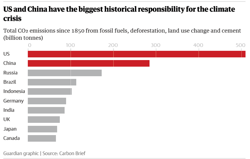 Un análisis realizado por Carbon Brief determinó el total de emisiones de dióxido de carbono de los países desde 1850 y reveló cuales son los países con la mayor responsabilidad histórica ante la crisis climática (dato crucial 1). La cantidad acumulada de dióxido de carbono emitido a la atmósfera está íntimamente ligada con el aumento en la temperatura de 1.2°C actual. La responsabilidad histórica de los países que se volvieron ricos gracias a los combustibles fósiles sustenta las demandas de justicia climática por parte de las naciones en vías de desarrollo; en este sentido, exigen financiamiento para lograr un desarrollo bajo en carbono y protección ante los impactos del calentamiento global.