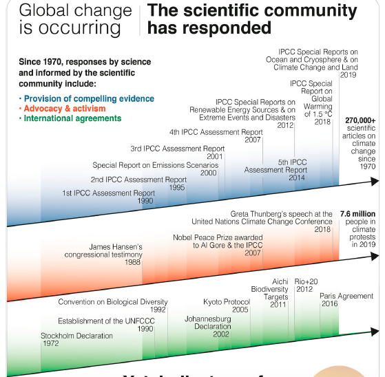 El trabajo de los científicos se expandió para comprender las causas sociales del cambio climático, sus impactos y riesgos, así como las respuestas de adaptación y mitigación. Al respecto, se crearon nuevas instituciones científicas para informar a los gobiernos.
