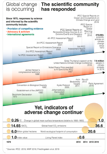 En 1988, el científico de la NASA James Hansen dio un discurso sobre el cambio climático ante el Congreso de Estados Unidos, el cual atrajo la atención del público y de los medios de comunicación internacionales. Sin embargo, la falta de respuesta a la evidencia científica llevó a Hansen y otros a protestar. Pero independientemente de la estrategia adoptada, los gobiernos son negligentes ante la llamada de atención sobre la urgencia de la acción climática (ver Figura 1).