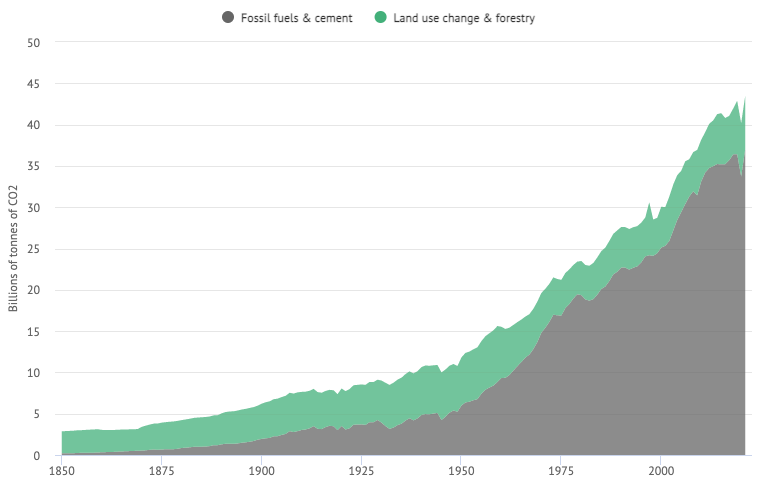 Figura 1: Emisiones globales anuales de CO2 procedentes de combustibles fósiles y cemento (gris oscuro), así como del uso de suelo, el cambio de uso de suelo y la silvicultura (verde), 1850-2021, en miles de millones de toneladas