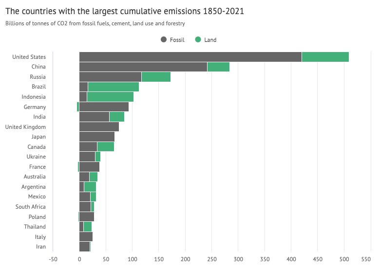 Figura 2: Los 20 mayores contribuyentes a las emisiones acumuladas de CO2 durante el periodo 1850-2021, en miles de millones de toneladas, desglosados en subtotales de combustibles fósiles y cemento (gris), así como de uso de suelo y silvicultura (verde).