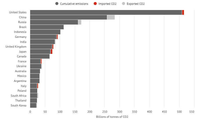 Figura 3: Los 20 mayores contribuyentes a las emisiones acumuladas de CO2 basadas en el consumo, 1850-2021, en miles de millones de toneladas. Las barras grises muestran las emisiones sobre una base territorial con el CO2 exportado mostrado en gris claro y las importaciones mostradas en rojo.