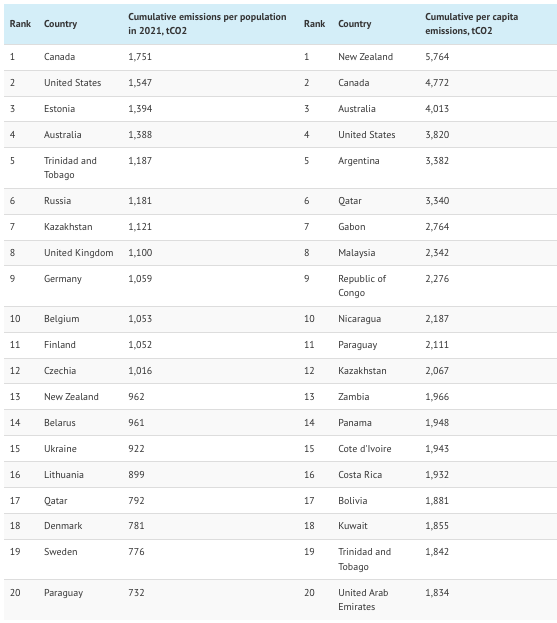 Figura 4: Los 20 países con más emisiones acumuladas entre 1850 y 2021 ponderadas por la población en 2021 (izquierda), frente a los 20 países con más emisiones acumuladas per-cápita entre 1850 y 2021 (derecha).