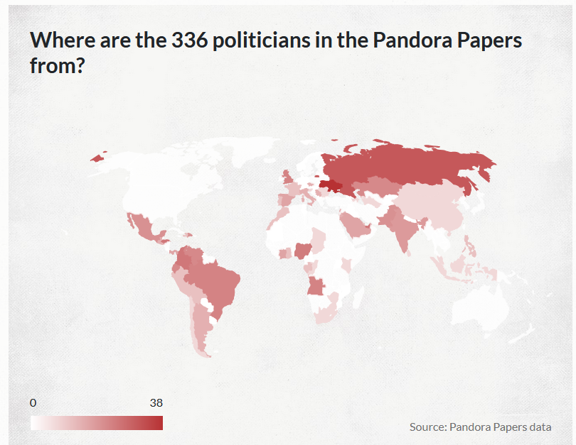 La investigación del Consorcio internacional de periodistas de investigación (ICIJ, por sus siglas en inglés), conocida como Papeles de Pandora, reveló algunos de los secretos financieros de 35 líderes mundiales, más de 330 políticos y funcionarios públicos de 91 países, así como la participación global de fugitivos, estafadores y asesinos.
