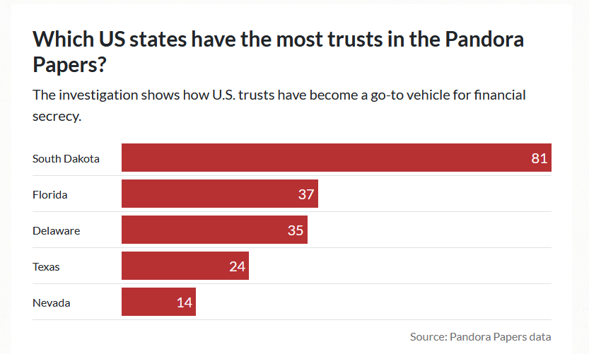 Aunque las autoridades estadounidenses presionan a los países caribeños y a los bancos suizos para obtener información de los estadounidenses con cuentas bancarias en sus jurisdicciones, este país se ha negado desde 2014 a sumarse a una iniciativa para que los bancos estadounidenses compartan información sobre los activos de personas extranjeras. Sólo en Dakota del Sur, el valor de los bienes guardados en trusts alcanzó 360 mil millones de dólares en la última década.