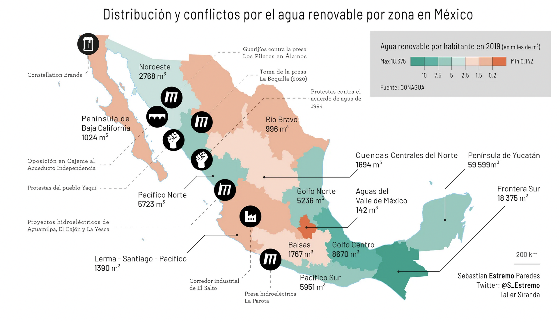 En México, la distribución y acceso al agua debe entenderse no sólo desde el ámbito natural, sino también desde el social y político, pues la apropiación y privatización del recurso exacerban los problemas de escasez de agua para uso doméstico. No es casualidad que donde más falta el agua es donde más proyectos extractivos hay. Y para las comunidades el problema no se limita a la falta de agua, pues en su proceso de lucha para defender sus fuentes de vida se enfrentan a diferentes tipos de violencia, injusticia y degradación a sus territorios.