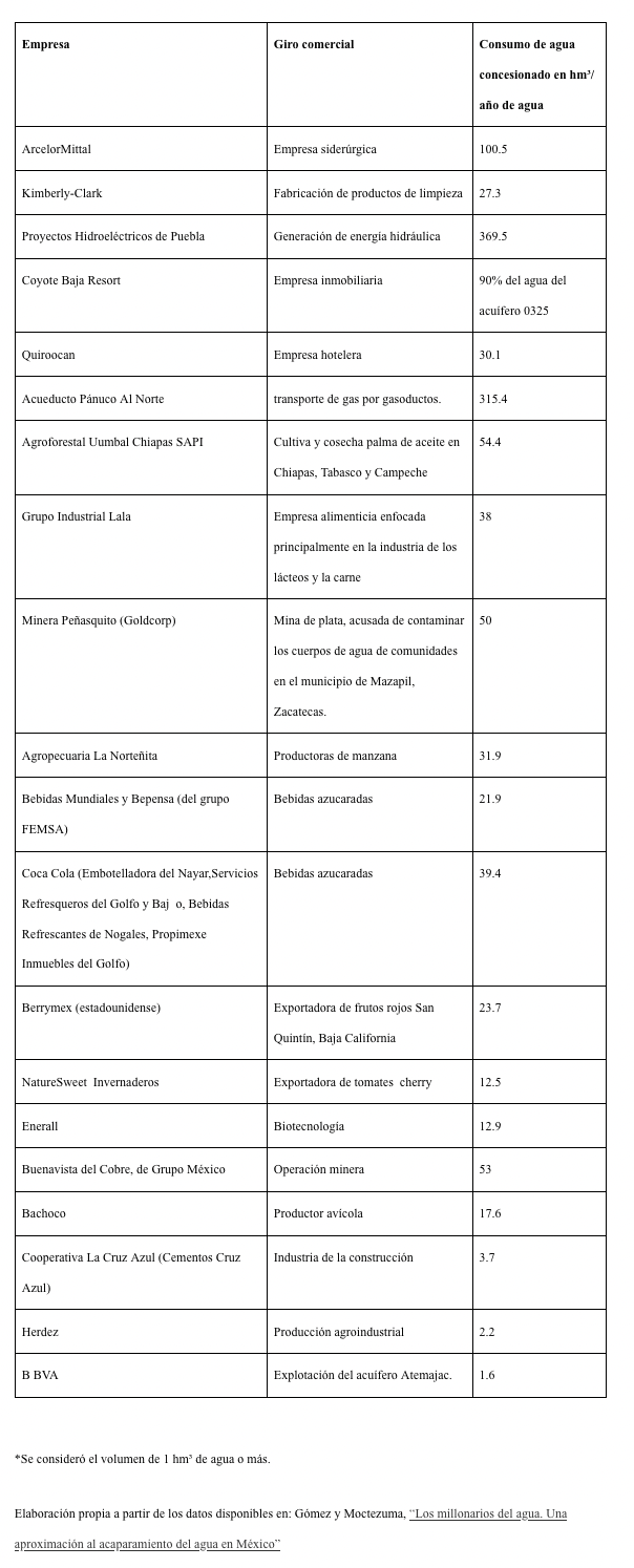 En países como México se agrava la situación, pues el Estado se mueve de acuerdo a los intereses neoliberales, eso queda claro con las cantidades de títulos y permisos de aguas nacionales que la Comisión Nacional del Agua ha otorgado desde 1993. Sumado a la concentración de las concesiones en manos de empresas privadas, para actividades industriales y proyectos energéticos. Ver Cuadro de empresas concesionarias en Datos cruciales.