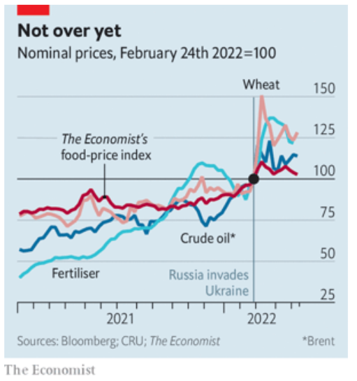 7. El 16 de mayo de 2022 los precios del trigo en Chicago, la referencia mundial, subieron 6%; el 18 de mayo fueron 39% más altos que cuando Rusia comenzó la invasión.