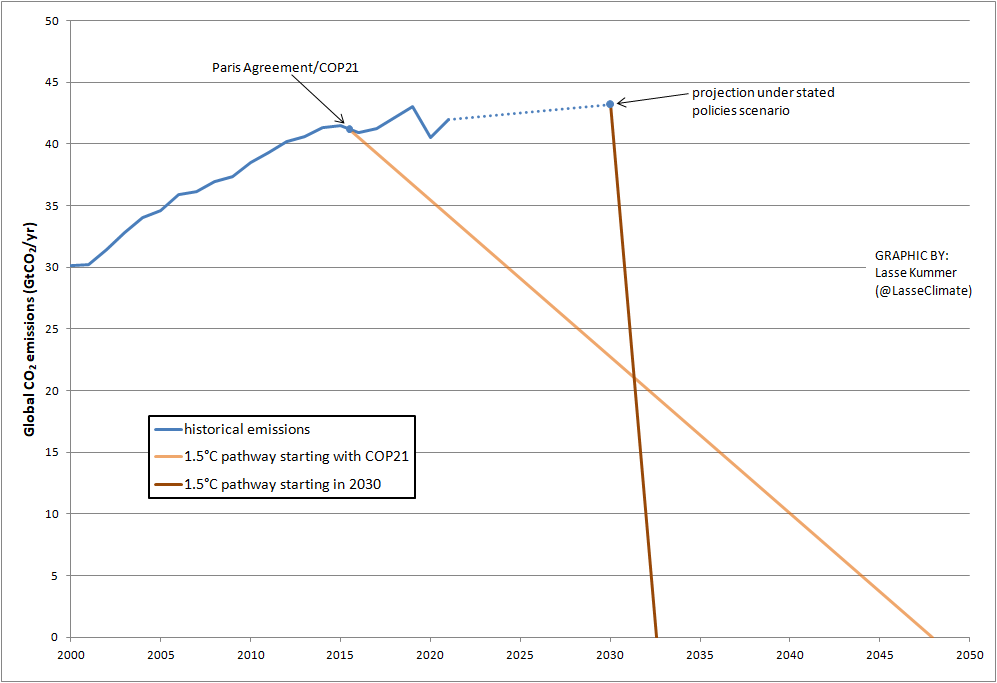 Cada año de retraso para la acción climática significa el consumo del presupuesto estadounidense para combatir las emisiones de carbono, también se elevan las temperaturas globales; mientras, el camino hacia cualquier transición energética se vuelve más vertiginoso. Este gráfico de 2021 del científico alemán Lasse Kummer ilustra el cambio histórico global: