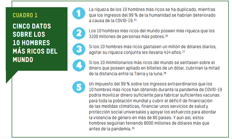 El reporte de Oxfam inicia con datos contundentes: desde que inició la pandemia de la covid-19, surge un nuevo milmillonario en el mundo cada 26 horas; los 10 hombres más ricos del planeta duplicaron sus fortunas, al tiempo que 160 millones de personas cayeron en la pobreza.