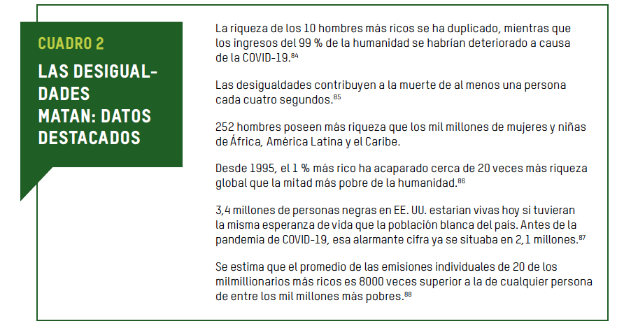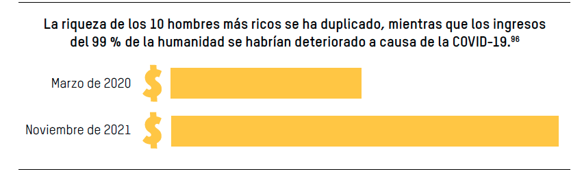 Las estructuras económicas no garantizan “los derechos de las personas en mayor situación de pobreza y vulnerabilidad”, incluso en situaciones de crisis como la pandemia. Al contrario, las estructuras económicas facilitan “activamente que quienes ya disfrutan de un poder y riqueza extremos se beneficien de esta crisis” (ver Dato crucial 29).