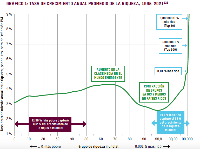4. Según World Inequality Lab, las personas más ricas del mundo (1% más rico) acapara “una parte 19 veces mayor del crecimiento de la riqueza global que la mitad más pobre de la humanidad” desde 1995.