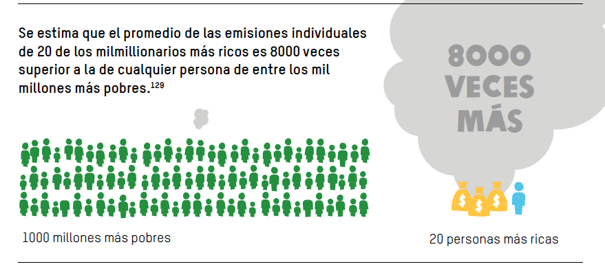 Las emisiones de carbono del 1% más rico representan el doble que las de la mitad más pobre de la humanidad. Las consecuencias del calentamiento global afectarán a todas las personas, lo cual queda evidenciado con las inundaciones y los incendios forestales vistos a lo largo de los años 2020 y 2021.
