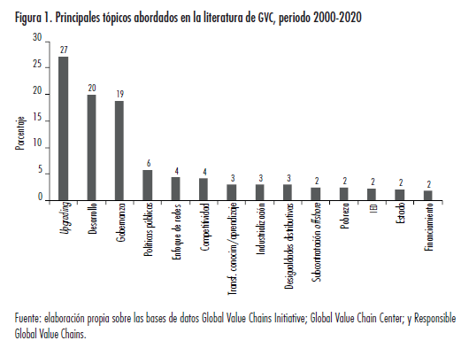 Con base en todo lo anterior, el enfoque de las GVC ha permitido estudiar las dinámicas económicas y la configuración productiva, ayuda a entender cómo se conforman las redes globales, cómo se distribuye el valor y cómo pueden incorporarse los espacios periféricos para impulsar su desarrollo. Cabe resaltar que el concepto de desarrollo se ha vinculado de forma cada vez más estrecha con los procesos de escalamiento, lo cual ha ido relegando los estudios centrados en la gobernanza. Esta concepción ha sido fuertemente asimilada por organismos internacionales como las Naciones Unidas, el Banco Mundial y el Banco Interamericano de Desarrollo, lo cual se ha reflejado en sus políticas de desarrollo enfocadas en la inserción en las cadenas globales de producción.