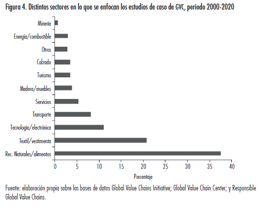 Otro aspecto fundamental en la problemática del desarrollo en el enfoque GVC es el análisis de los principales sectores en los que se llevan a cabo los estudios empíricos. En el dato crucial 4 “se observa la gran preponderancia que tienen los sectores vinculados con la extracción y elaboración de recursos naturales y alimentos, seguidos de la industria textil. Es decir, la propuesta de desarrollo por asociación a los encadenamientos productivos globales se centra en una industrialización ‘fácil’ vinculada a las ventajas comparativas ‘espurias’ de los recursos naturales y/o de la mano de obra barata existentes en diferentes países de la periferia global” (p. 12).