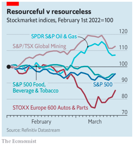 5. Las empresas mineras también están funcionando bien, impulsadas por los precios más altos de los metales, al igual que las siderúrgicas (excepto las rusas). Los precios de las acciones de US Steel y Tata Steel, con sede en Pittsburgh y Mumbai, respectivamente, han subido 38% y 11% desde la víspera de la invasión.