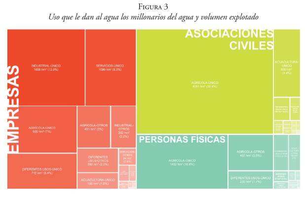 33. Los millonarios del agua concentran enormes volúmenes de agua: 13 millones 183 hm³/año en total para uso privado, de los 59 115 hm3/año concesionados. El grupo comprende 966 empresas tanto de energía eléctrica como cerveceras, acereras, agroindustrias, mineras, papeleras, automotrices, embotelladoras, entre otras, que explotan 5 805 hm³/año; 1,537 personas físicas dueñas de concesiones por 2 547 hm³/año de agua y 801 asociaciones civiles que tienen concesionados 4 856 hm³/año.