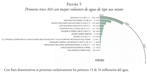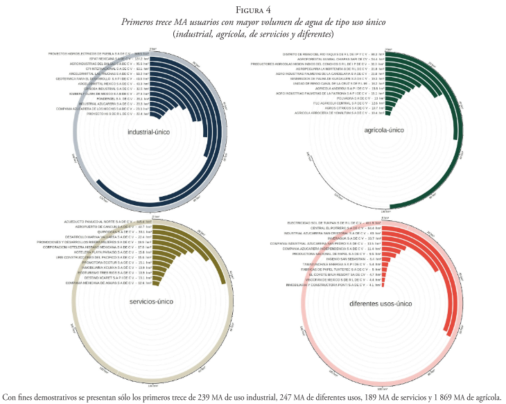 El uso-único industrial representa 13% del volumen total de agua en manos de los ma (Dato Crucial 7), entre los que se encuentra la empresa transnacional Kimberly-Clark (Dato Crucial 8) y Proyectos Hidroeléctricos de Puebla (Dato Crucial 9). En el caso de uso único para diferentes usos, se encuentran termoeléctricas, agroindustrias y constructoras como el megaproyecto inmobiliario El Coyote Baja Resort (Dato Crucial 10). En el uso único para servicios están las grandes cadenas hoteleras y una empresa de transporte de gas por gasoductos (Dato Crucial 11). Finalmente, destaca el uso-único agrícola por ser el principal empleo de agua concesionada a los ma (48.7%), destacando la empresa Agroforestal Uumbal Chiapas Sapi (Dato Crucial 12) y Agropecuaria La Norteñita (Dato Crucial 13).