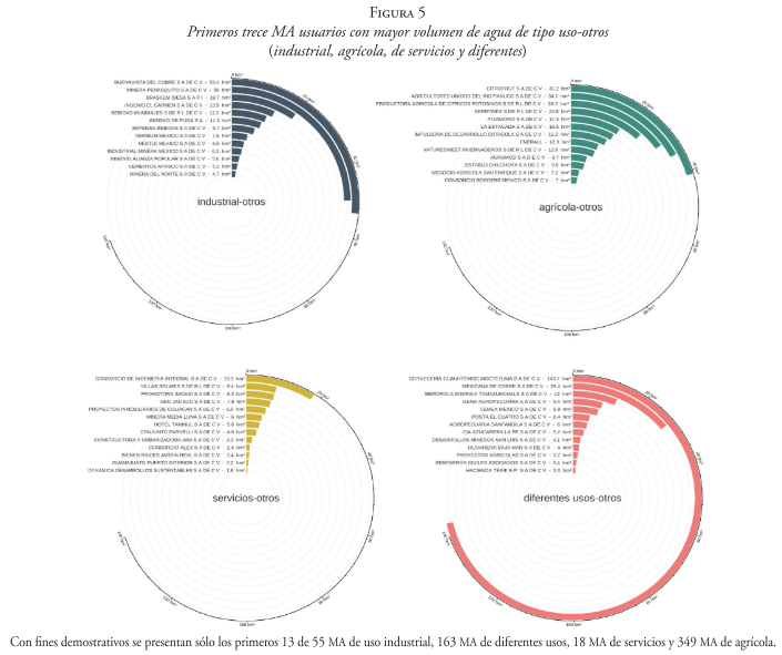 En el uso industrial-otros destacan la minera Peñasquito (Dato Crucial 17), la firma Bebidas Mundiales y Bepensa de femsa (Dato Crucial 18); en el agrícola-otros perfila la empresa estadounidense de frutos rojos Berrymex (Dato Crucial 19), la empresa exportadora de tomates cherry NatureSweet Invernaderos (Dato Crucial 20) y la empresa biotecnológica Enerall cuyo fundador es Alfonso Romo Garza, jefe de la Oficina de la Presidencia de México en los primeros años de la administración de Andrés Manuel López Obrador (Dato Crucial 21).