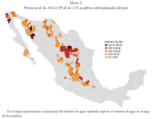 27. Los ma tienen amplias concesiones de agua subterránea y explotan 47.2% (5 024 hm³/año de agua) del total de agua de este tipo otorgada a los usuarios que tienen concesiones de 1 hm3/año o más (p. 34).