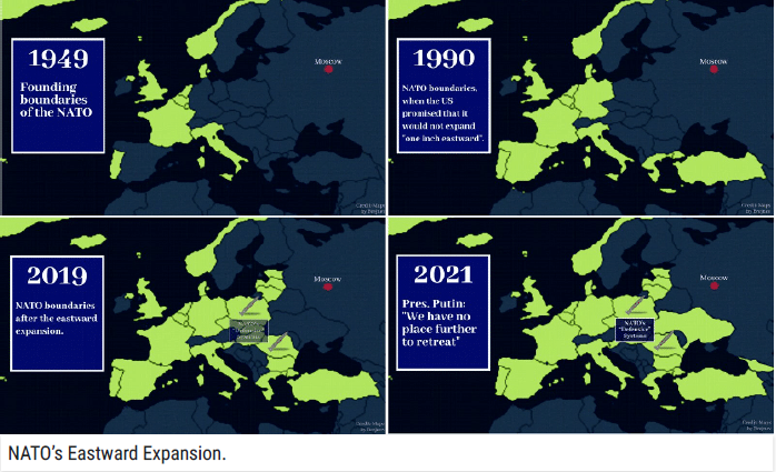 Aunado a lo anterior, desde el fin de la Guerra Fría, la Organización del Tratado del Atlántico Norte (OTAN) ha llevado a cabo una expansión al Este europeo que viola el “acuerdo de caballeros” que Gorbachov hizo con Estados Unidos, en el cuál los norteamericanos prometieron que su zona de influencia no llegaría a ex-miembros de la URSS. Contrario de lo prometido, actualmente 14 países del Este de Europa se han unido a la OTAN y en 2018, Ucrania realizó cambios en su constitución para ser parte de la organización y de la Unión Europea. Lo último, representa una amenaza directa a la seguridad nacional rusa, ya que Kiev se encuentra a solo 760 km de Moscú.