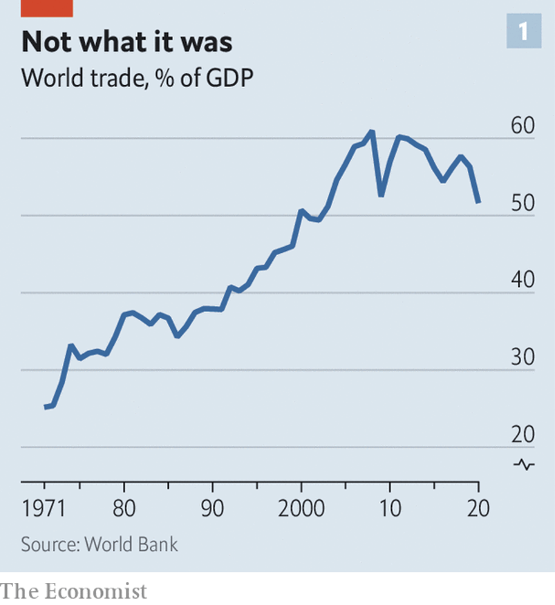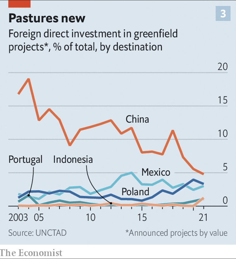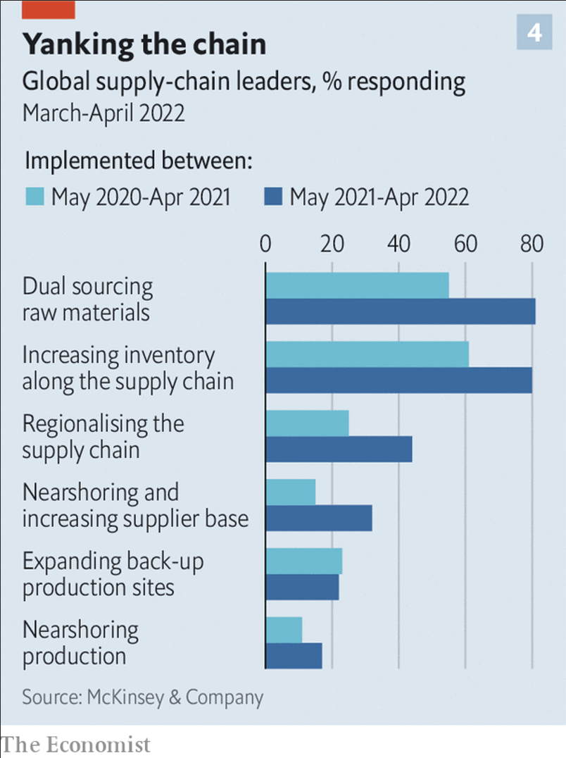Antes de que las consecuencias económicas de la pandemia de COVID 19 hiciera obvias las debilidades de las cadenas de suministros y la globalización ya se habían dado ciertas alertas. La IED y el comercio bajaron su ritmo de crecimiento, la subida de los salarios en los centros de producción (ver dato crucial 4) In 2000 China’s average annual income per person expressed in dollars, a reasonable proxy for the wage costs facing a multinational firm, was 3% of America’s. That is one reason why the country’s accession to the World Trade Organisation the following year was so transformative. By 2019 that had risen to 16%... y la automatización quitaron peso a la ventaja competitiva que las empresas estaban aprovechando y cuando los desastres naturales afectaron centros de producción se mostraron las consecuencias de una baja diversificación de proveedores.