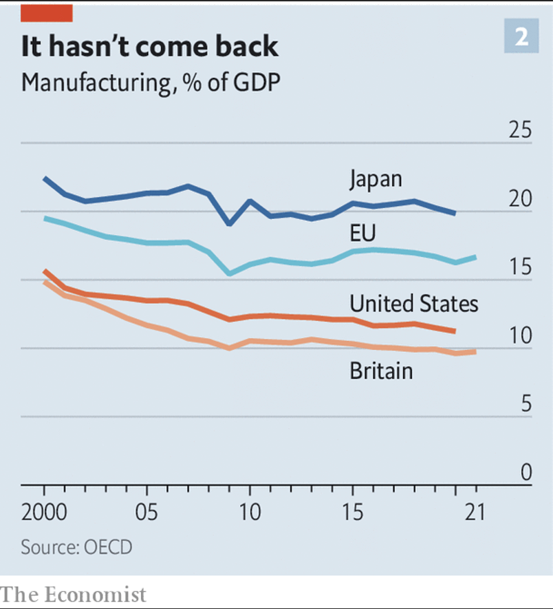Aunque el discurso de la autosuficiencia podría hacernos pensar que la producción está regresando a los países ricos, por el momento, la realidad es otra. La participación de las manufacturas en los países de la Organización para la Cooperación y el Desarrollo Económicos OCDE es apenas 13% del PIB, un mínimo histórico.