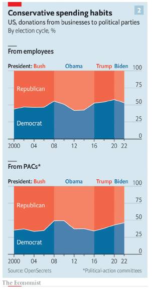 Tradicionalmente, el Partido Demócrata siempre ha presentado problemas para las grandes compañías; ejemplo de ello, es el hecho de que a principios de agosto de 2022, los demócratas en el senado hayan aprobado un incremento a los impuestos y restricciones a las empresas. Sin embargo, los ejecutivos de las compañías se enfrentan a un inconveniente inesperado: un creciente desdén entre las filas republicanas hacia las grandes empresas, lo que ha provocado que las compañías se cuestionen qué tan beneficioso sería que el Partido Republicano recupere la presidencia de Estados Unidos para 2024.