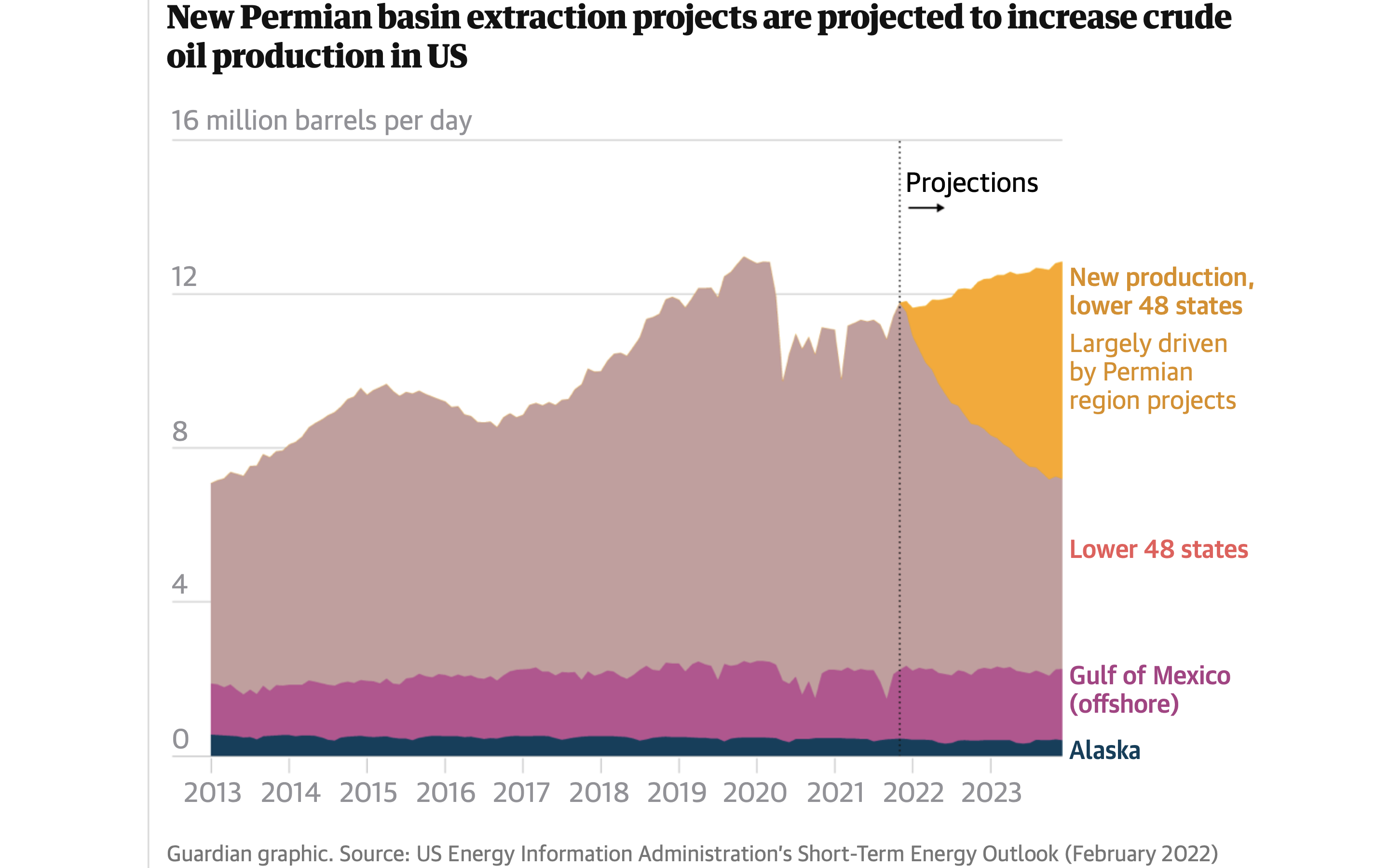 4. La petroleras estadounidenses Exxon y Chevron pronostican aumentos de 100 000 barriles por día y 60 000 barriles por día, respectivamente, provenientes de la Cuenca Pérmica. Se calcula que en 2023 se extraerán 12.6 millones de barriles diarios en Estados Unidos, lo que marcará un hito para la historia de la producción petrolera del país.