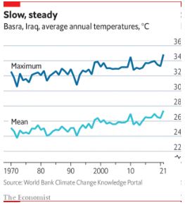 2.- La temperatura media en Basora, la ciudad más cercana a Abu es 2.5℃ más caliente de lo que era en la década de 1980. En julio alcanzó 53.9℃, un recórd.