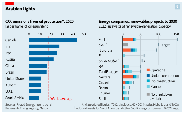 Las grandes petroleras de Emiratos Árabes Unidos y Arabia Saudita, ADNOC y Aramco, respectivamente, son lideres en el tema de políticas y medidas para impulsar la transición energética y la descarbonización.
