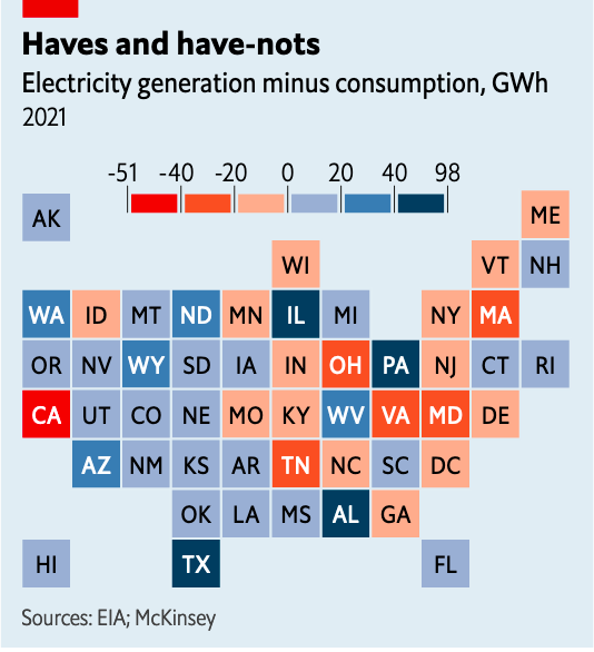 9) La imagen detalla el diferencial entre la generación de electricidad y su consumo. Dentro de la escala energética (en GWh) propuesta por EIA-McKinsey los estados que presentan un mayor déficit energético son California (superando por mucho), Tennessee, Ohio, Maryland, Massachusetts y Virginia.
