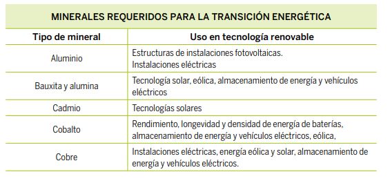 Las energías renovables usan diversos tipos de minerales; en consecuencia, se proyecta que para evitar el alza de la temperatura a más de 2°C la demanda de minerales como aluminio, cobre, incrementará significativamente (Dato Crucial 11). Tanto la energía fotovoltaica como las instalaciones de almacenamiento de energía requieren de mucho cobre (Dato Crucial 12).