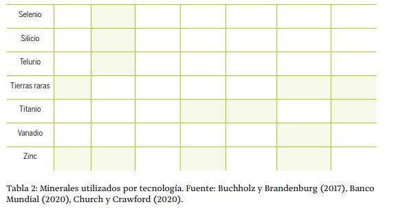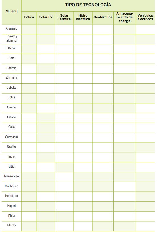 A comienzos del sigo XXI, el sector energético representó una pequeña fracción del total de la demanda de minerales. Desde entonces, con el avance de la transición energética, las energías renovables han aumentado la demanda de minerales (Dato Crucial 6). En el futuro próximo la oferta y demanda de los minerales críticos estará determinada por los minerales que utilicen las tecnologías renovables y de almacenamiento de energía. Las siguientes tablas describen en qué tipos de tecnologías pueden ser usados algunos minerales: