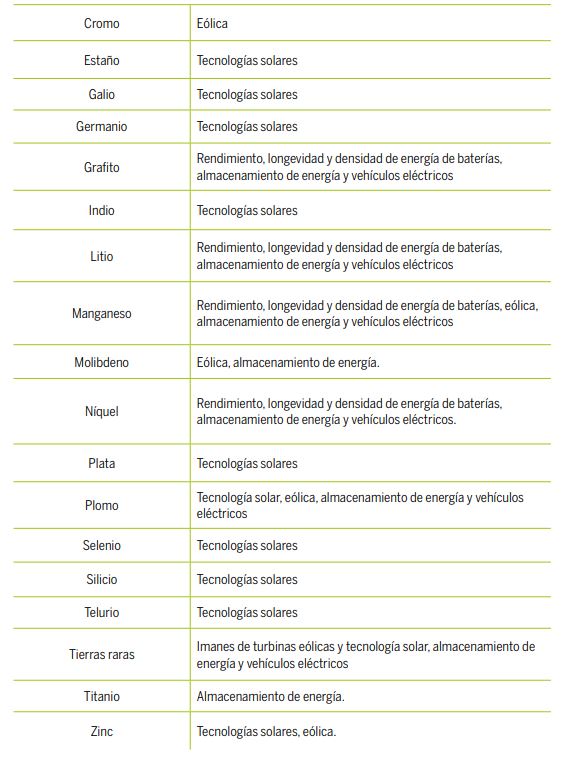 La demanda de minerales dependerá de la cantidad de tecnologías renovables en las que puedan ser utilizados. Por ejemplo, el níquel, el manganeso, el cobre y el cromo son claves para todo sistema eléctrico de energía renovable; pero, la demanda de minerales como el litio, germanio, galio o el estaño es incierta pues depende del desarrollo de un tipo especifico de tecnología.