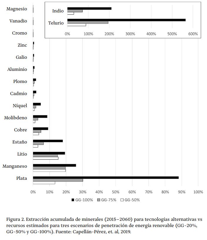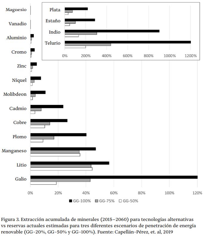 El elemento clave de este apartado son las proyecciones de incremento de la energía renovable y la demanda de cada tipo de mineral utilizado en las tecnologías de energías renovables. Este capítulo identifica los límites físico-técnicos de la extracción de minerales, la capacidad para reciclarlos, disminuir su impacto y visualizar las alternativas existentes para transitar a otro estilo de vida.